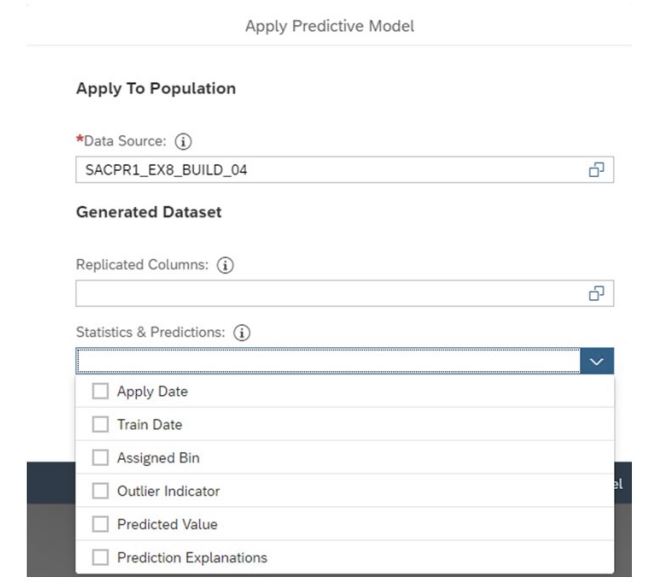 - Under Generated Dataset, choose which columns to include in the output (e.g., predictions, statistics).